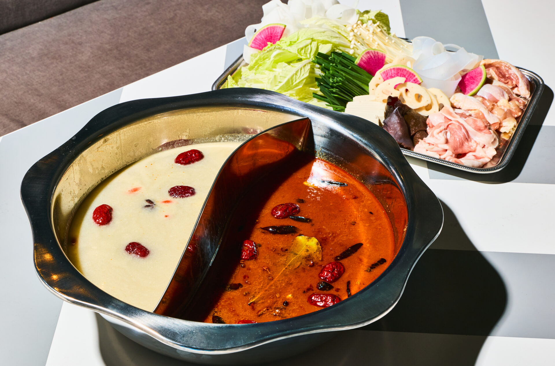 唐辛子や花椒(ホアジャオ)がたっぷり入った痺れる辛さが魅力の「麻辣スープ」と、鶏や豚の旨みが溶け出したまろやかで優しい「白湯(パイタン)スープ」を同時にお楽しみいただけます。対照的な2種のスープを心ゆくまでご堪能ください。