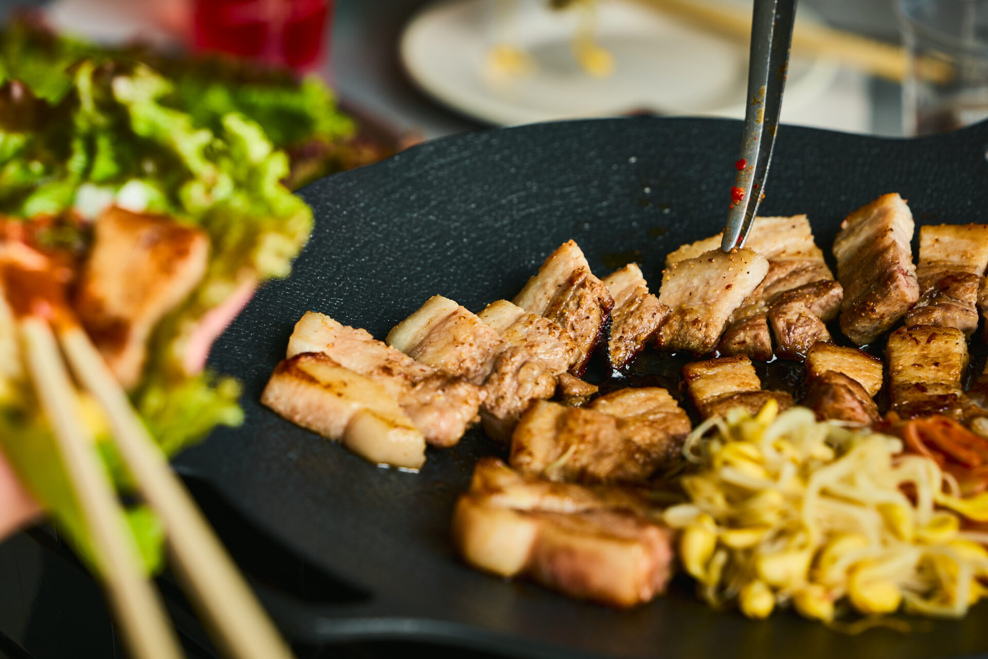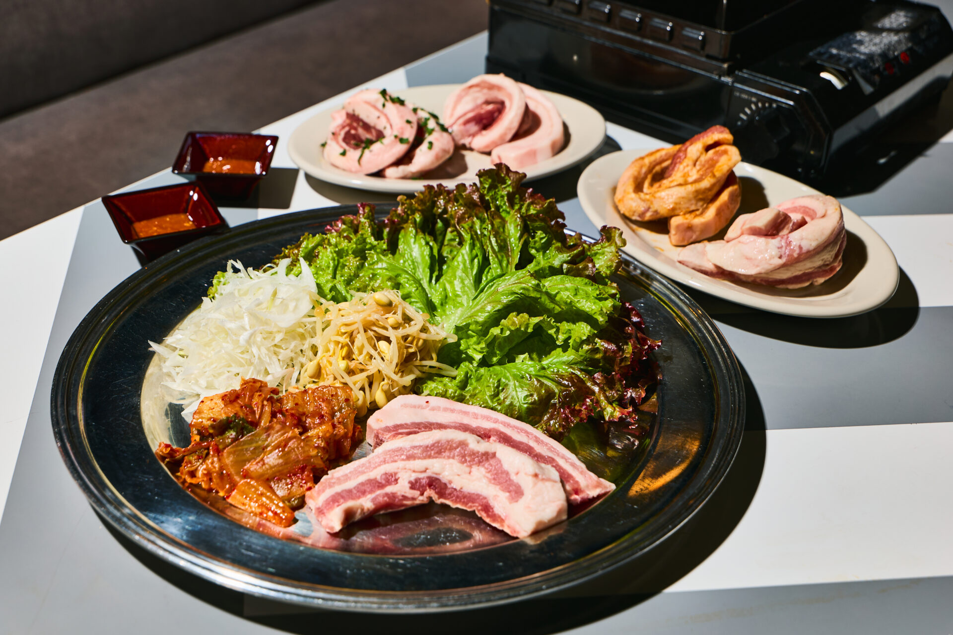 熱々の鉄板でジュージューと音を立てる厚切り豚バラ肉の香ばしい香りが食欲をかき立てる、韓国の国民的料理「サムギョプサル」。野菜のシャキシャキ感、そしてキムチのピリ辛さが絶妙なハーモニーを奏でます。追加におすすめの豚バラ肉は、プレーンに加えて3種類のフレーバーをご用意。鉄板を囲みながらワイワイと食べ比べをお楽しみください。